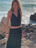 The exclusive QALATA metallic clasp sets this piece apart, infusing it with an air of mystery and sensuality. The top features an elegant halter neckline with a flattering draped décolletage that adds structure and refinement. It is paired with a lightweight midi skirt with fluid movement, creating a silhouette that perfectly balances boldness and sophistication.