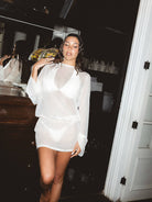 • Indonesia Ivory Dress, sheer mesh, reversible, with bell sleeves and adjustable ties with stainless steel details
