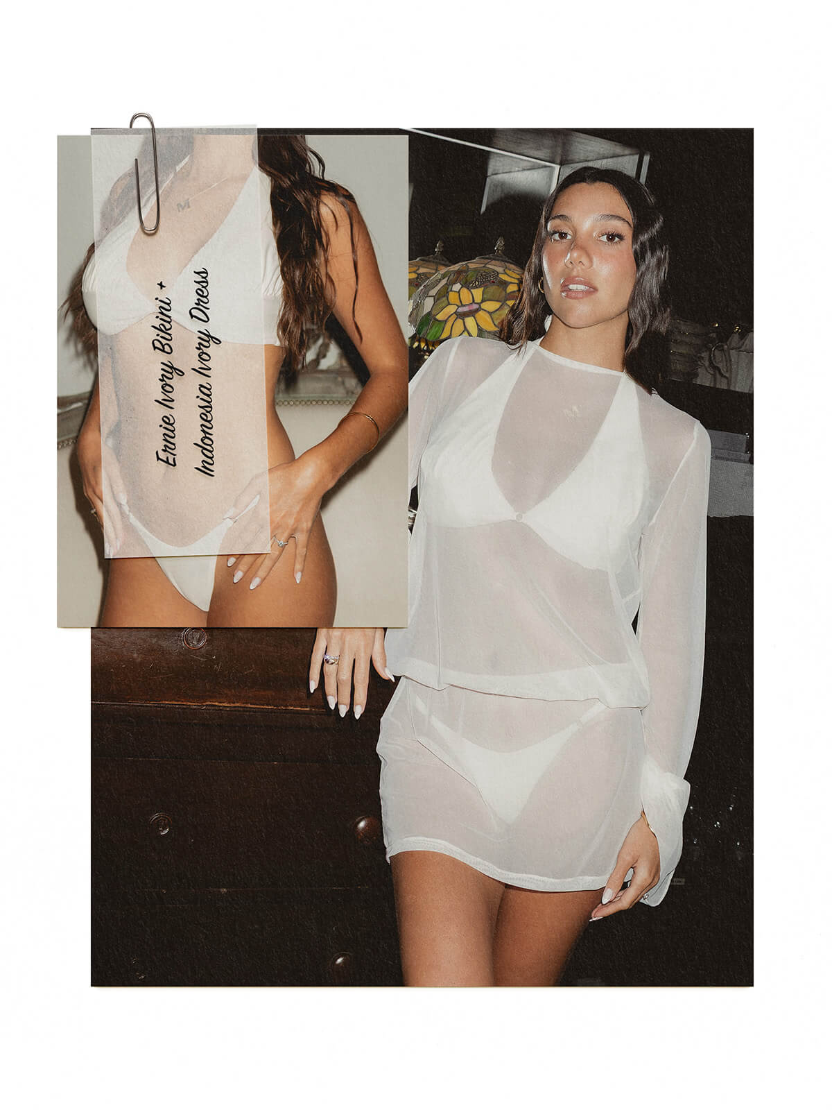 Mafer wears Bikini Top L and Bottom S, and Dress size S